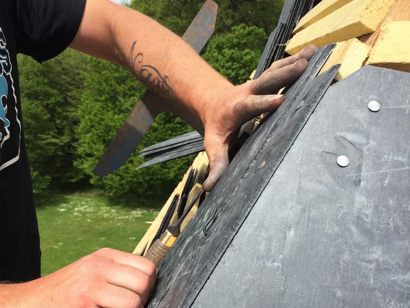 Réalisation d’une noue ronde à 1 tranchis en ardoises naturelles
